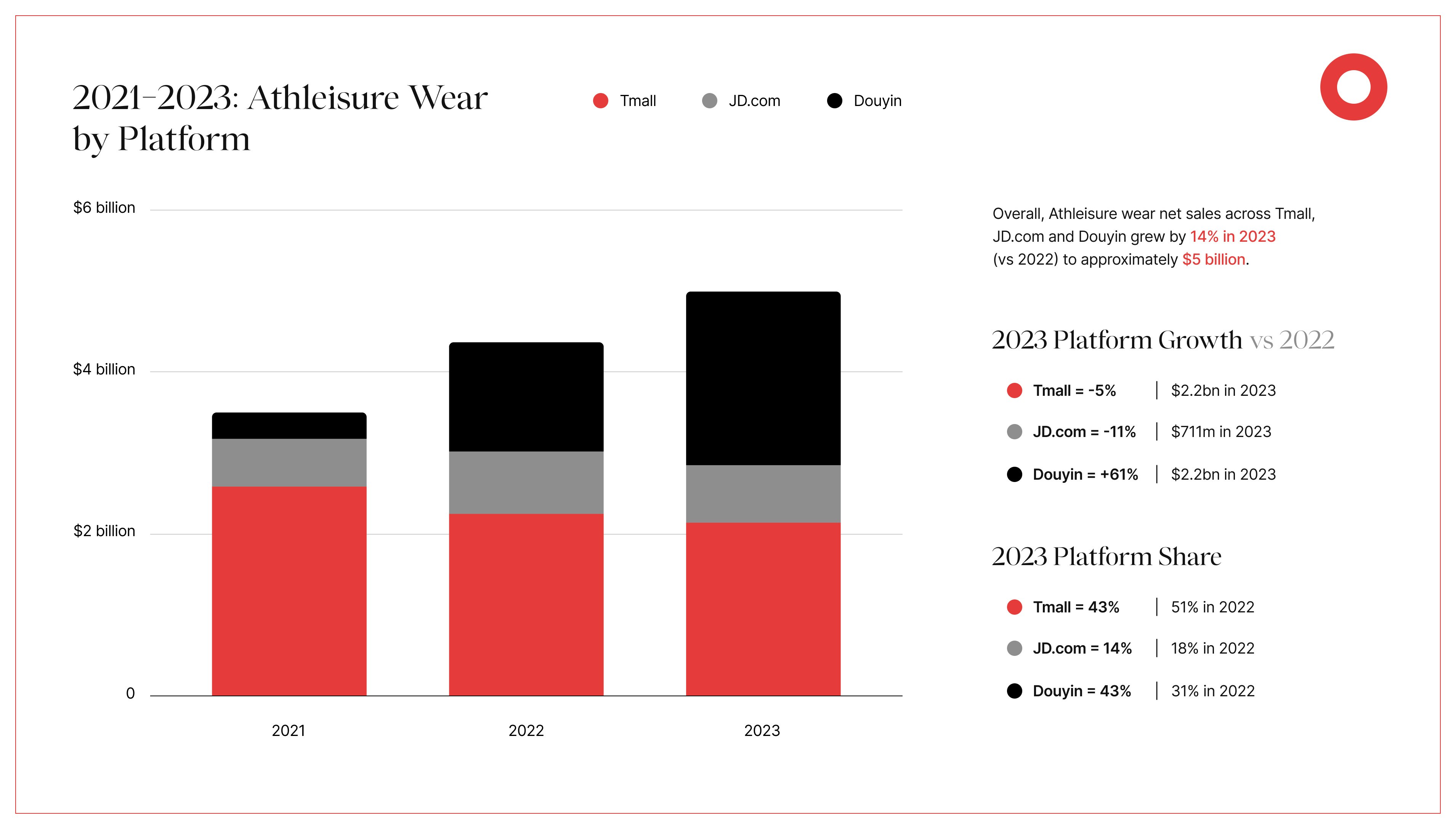 Douyin, China’s version of TikTok, has become an unignorable force in ecommerce, challenging major platforms like Tmall. From 2022 to 2023, Douyin saw a remarkable 61% growth in athleisure sales, generating $2.2 billion in net sales in 2023, putting it on a par with Tmall.