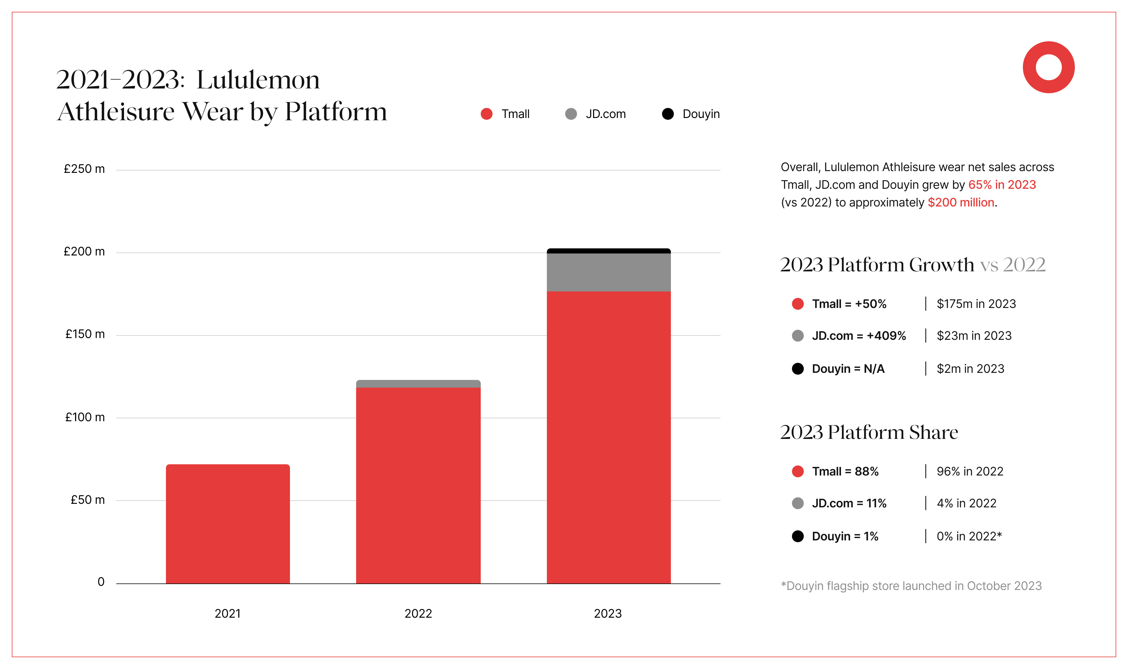 Image: A breakdown of Lululemon athleisure wear sales by platform in China from 2021 to 2023