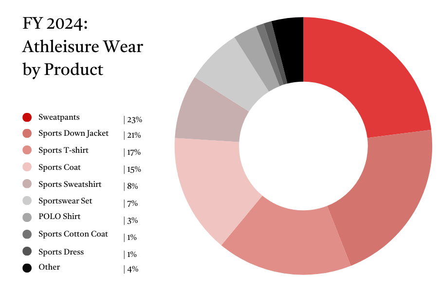 Sweatpants (23.1%) represented the biggest product category within athleisure wear across Tmall, JD.com and Douyin in 2024, followed closely by sports down jackets (20.9%).